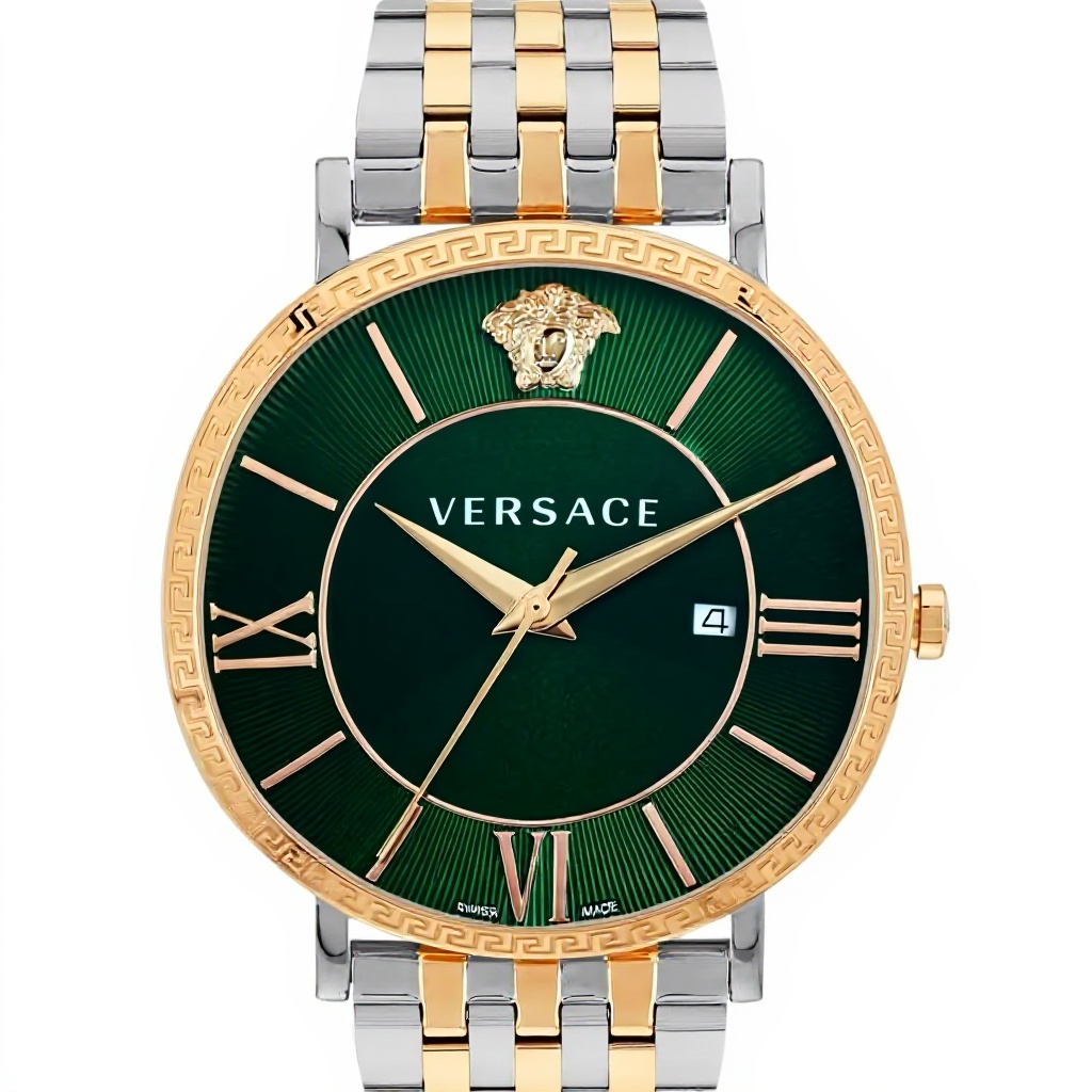 La montre Versace V-Eternal Gent Date incarne l’élégance masculine avec son cadran rond vert distinctif, offrant une heure analogique précise et un affichage de la date intégré. Fabriquée avec soin, elle allie design sophistiqué et fonctionnalité moderne pour un accessoire horloger fiable et raffiné.