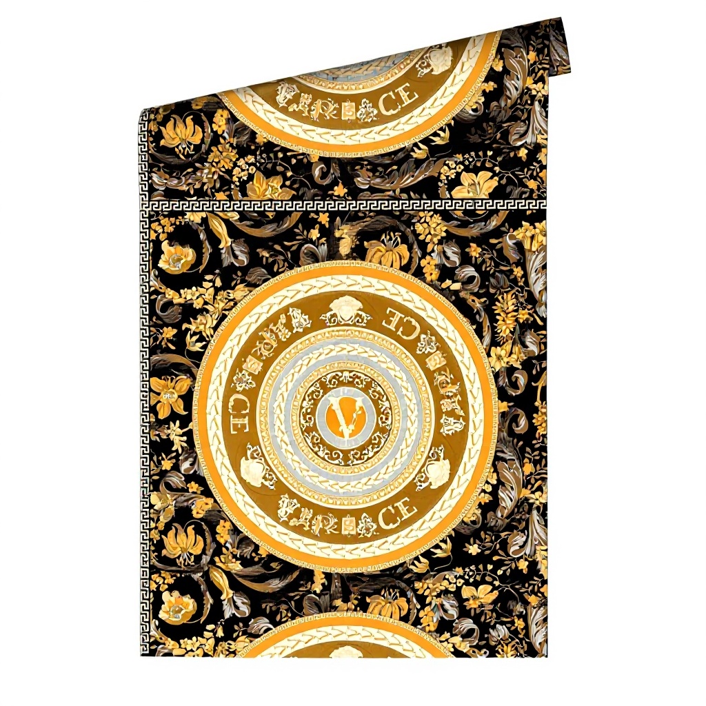 Ce papier peint intissé de luxe de Versace Home présente un motif floral élégant combinant des tons dorés, noirs et argentés. Fabriqué en satin non-tissé avec un fini légèrement brillant, il offre une pose simplifiée grâce à sa méthode d’installation sans colle. Le produit est certifié RAL et FSC, garantissant qualité et respect de l’environnement.