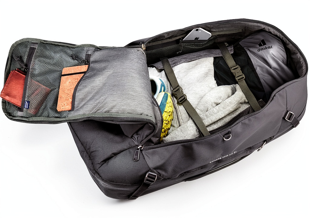 - Compartiments organisés avec fermetures éclair et sangles de compression pour un rangement sécurisé et efficace.