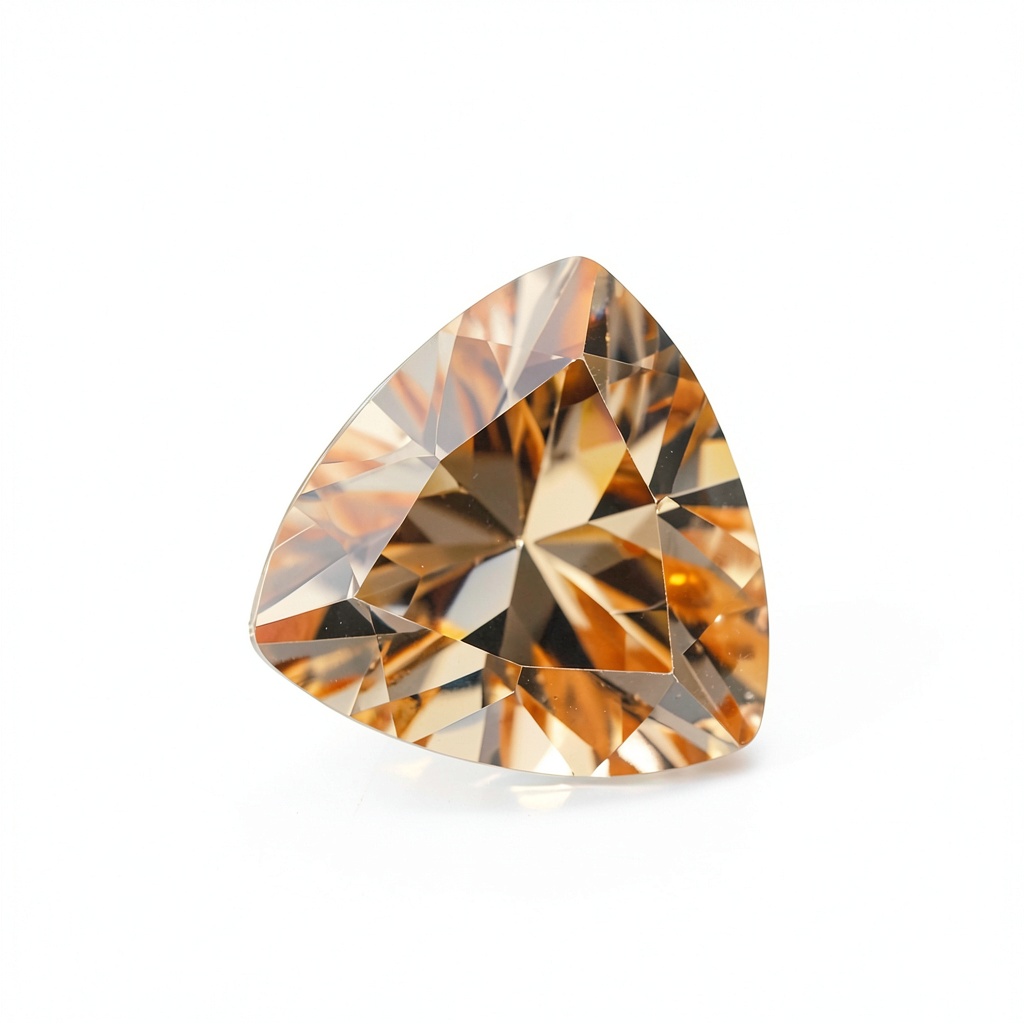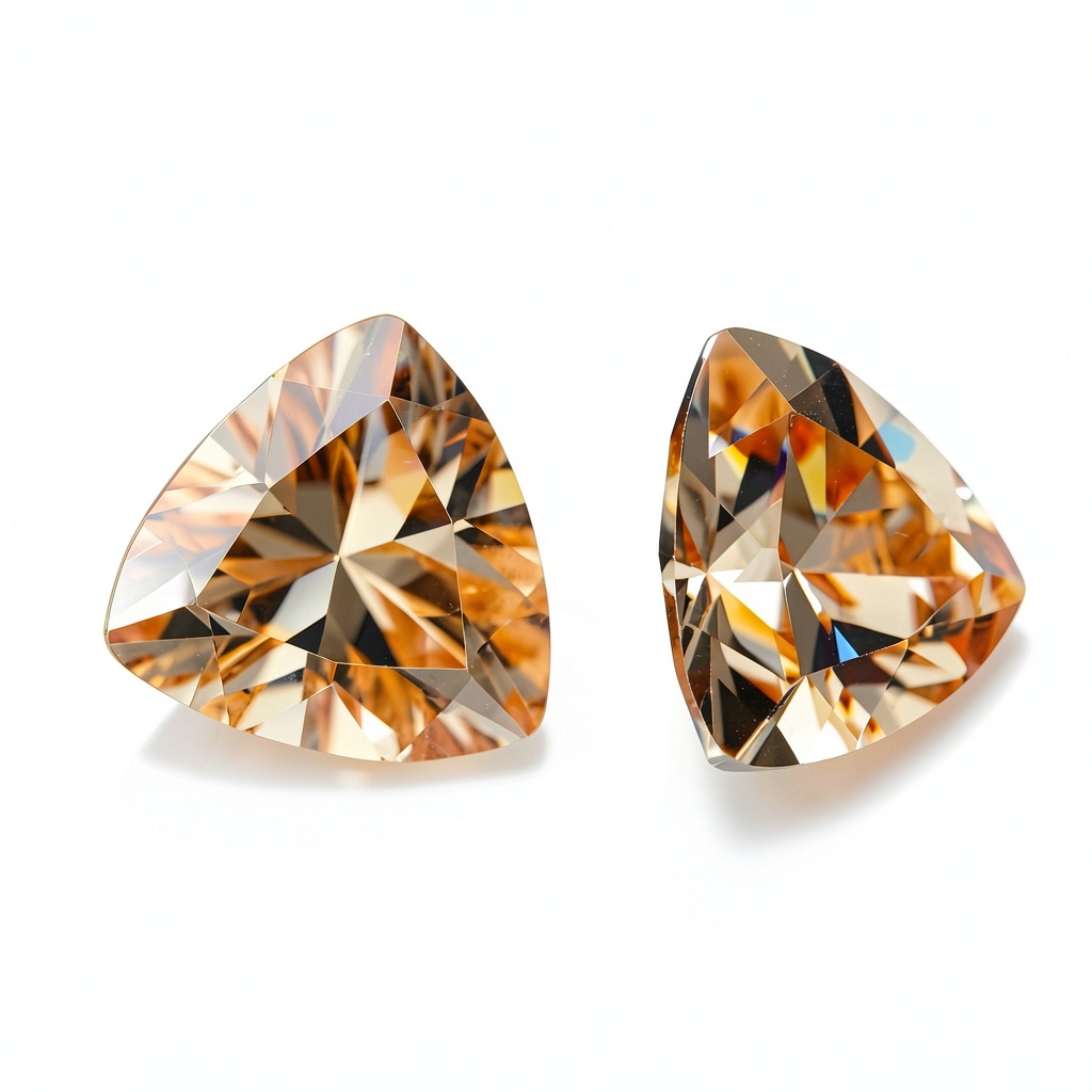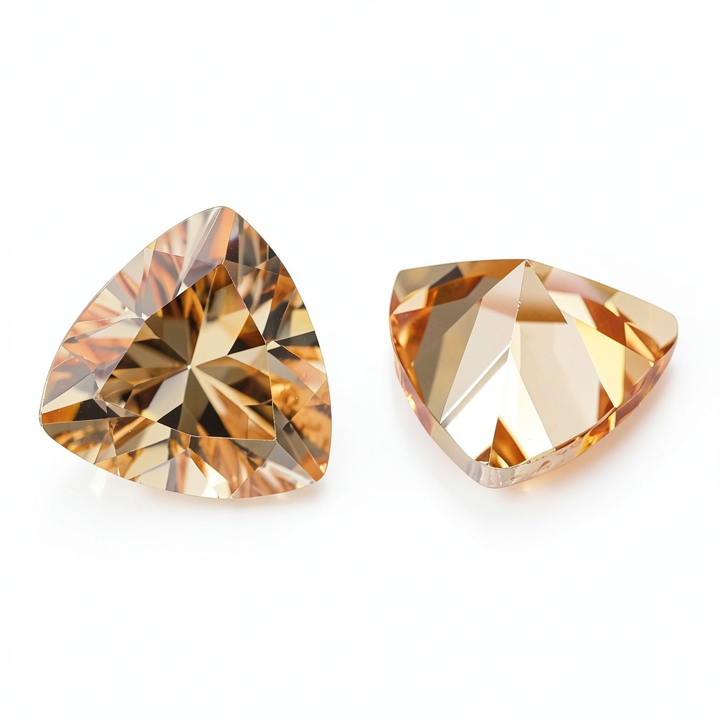 Ces pierres sont spécifiquement en oxyde de zirconium avec une couleur champagne unique et une coupe trillion qui maximise leur réfraction lumineuse. Leur résistance thermique supérieure les distingue des zircones standard, permettant des applications de joaillerie plus exigeantes.
