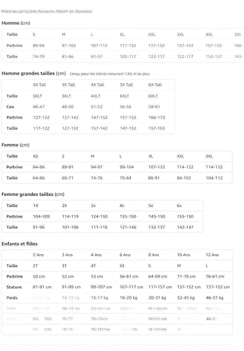 Le t-shirt est proposé dans un large éventail de tailles, incluant S, M, L, XL, XXL, 3XL, 4XL, 5XL, 6XL, ainsi que des tailles pour hommes, femmes et enfants, avec des options comme 2X Tall pour une meilleure adaptation.