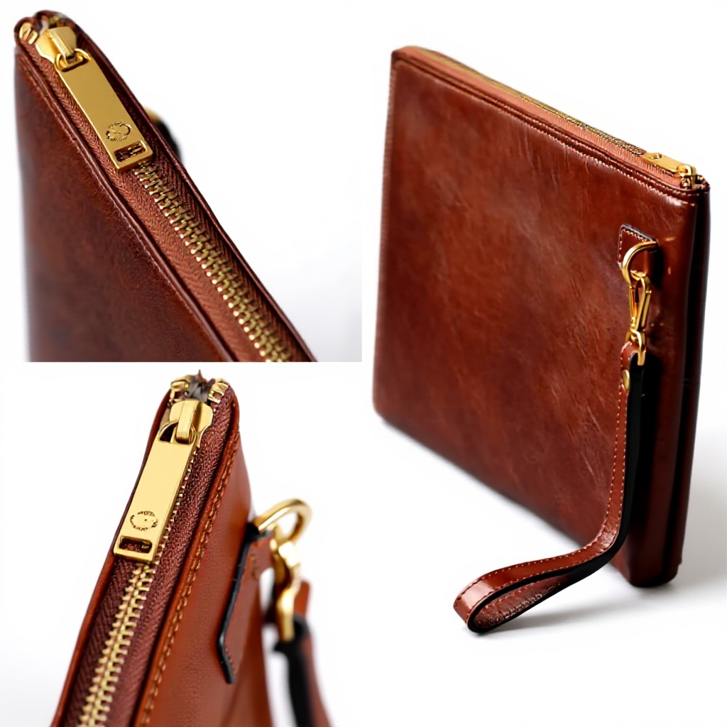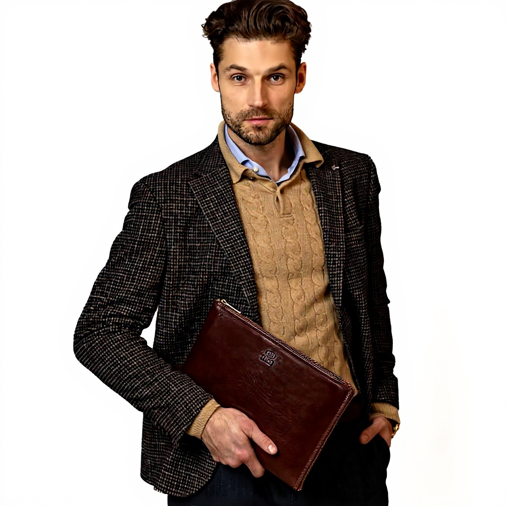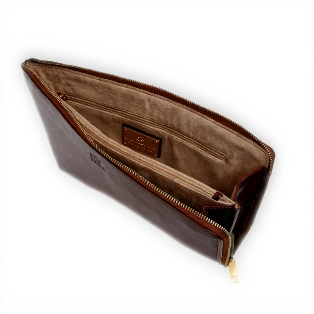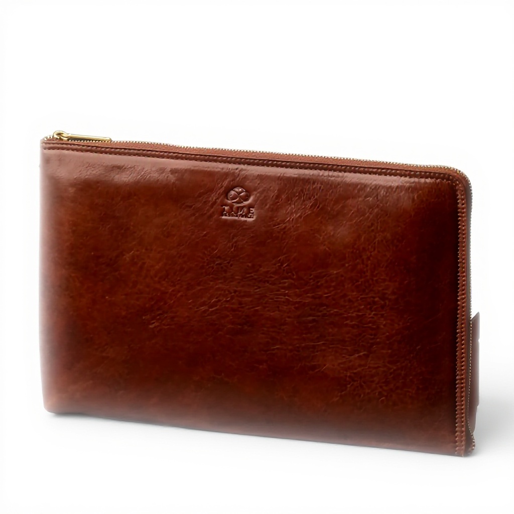 Cette pochette en cuir pleine fleur est fabriquée artisanalement en Italie, avec une attention particulière portée aux détails et à la durabilité. Elle dispose d’une sangle de poignet amovible pour un transport facile et un compartiment principal spacieux avec une cloison intégrée.